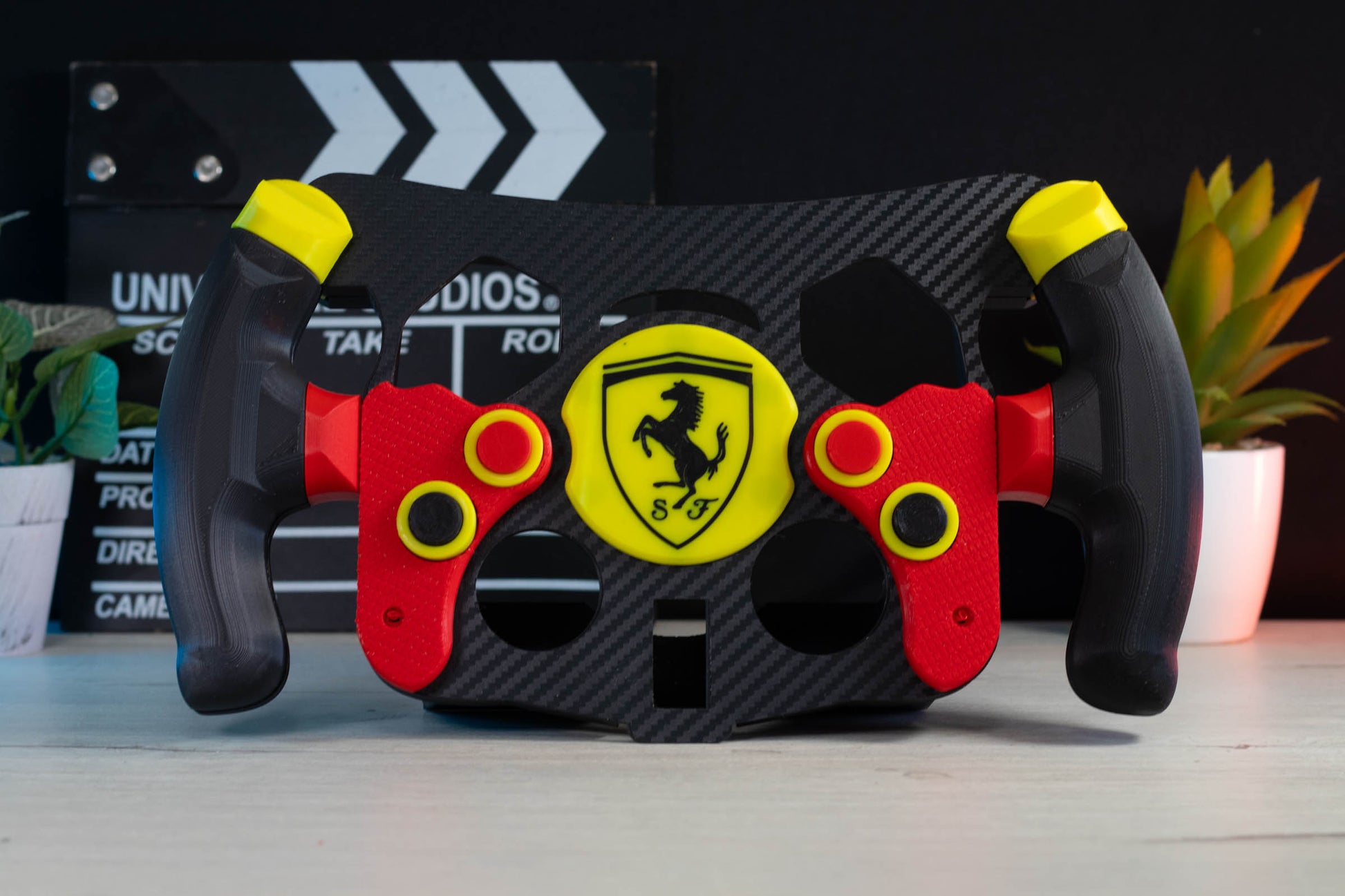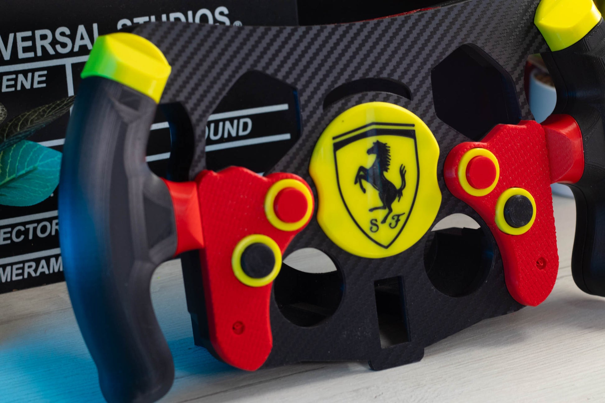 Los mangos del volante están cubiertos de cuero de alta calidad, proporcionando un agarre cómodo y seguro, ideal para largas sesiones de juego. La parte frontal está vinilada con vinilo efecto carbono, ofreciendo un aspecto elegante y profesional.